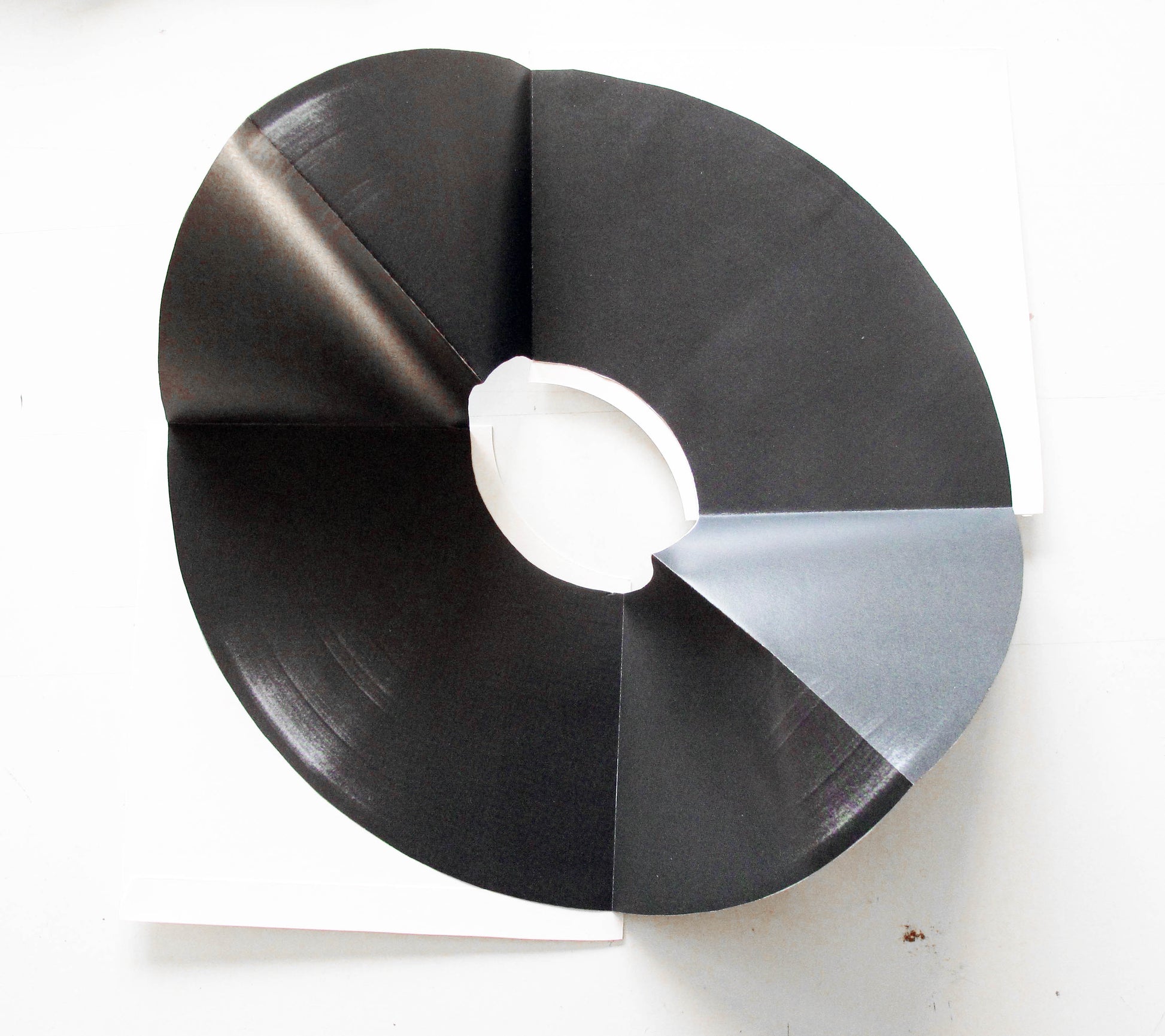 The image of the record is a scanned record sleeve that is used in second hand or sale record displays when the original sleeve has been lost. It has been cut out so it resembles the vinyl part of a 12 inch record, the size is accurate and is folded in quarters with a further fold. It is glued to two sections of a record sleeve that has been cut into quarters to form a minimal pop up book.